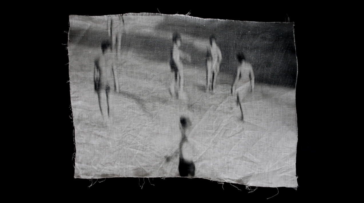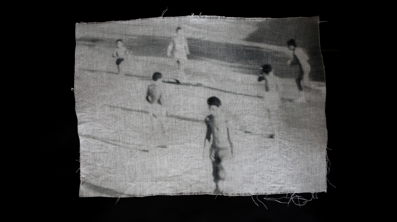 The images are enlarged and transferred onto linen. The prints are then immersed in seawater and exposed to the sun.