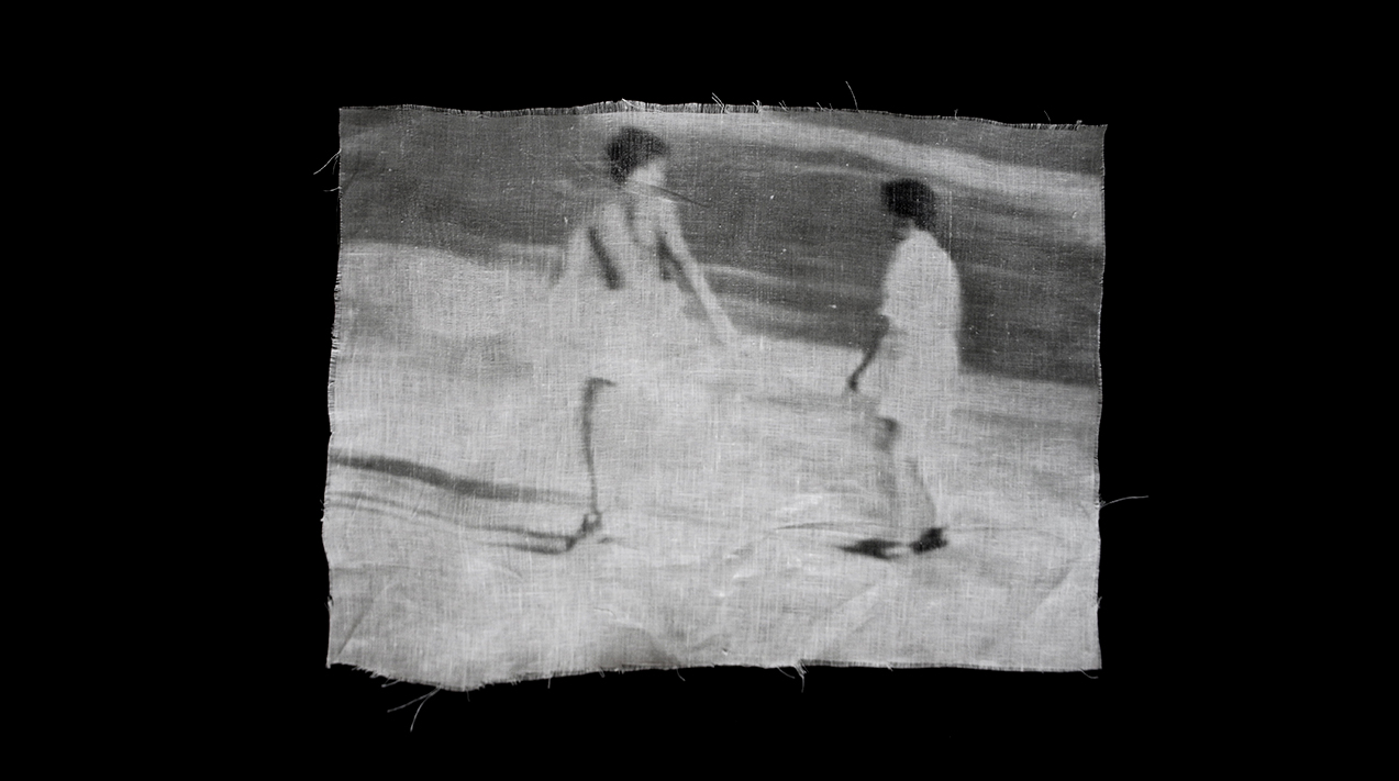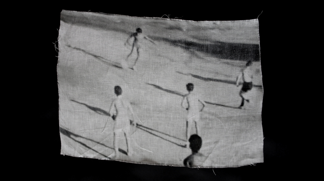 Les images sont agrandies puis transférées sur du lin. Les tirages sont ensuite plongés dans l’eau de mer et exposés au soleil.