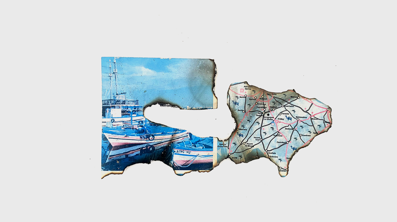 Postcards are burned at the precise spot where the sea appears. What disappears reveals as much as it erases. In Arabic, harka means both to burn and to make the crossing.
